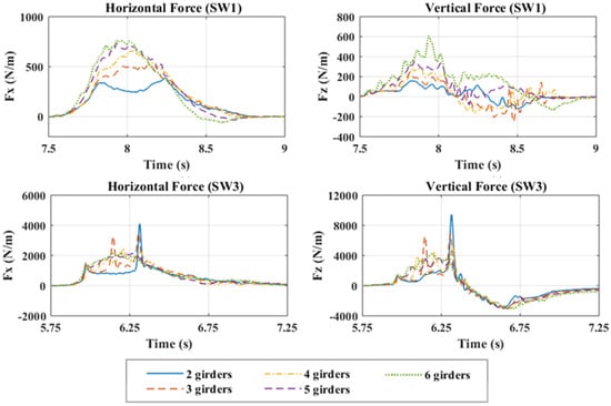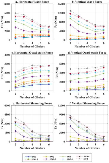 Figure 10 depicts the maximum values of the total horizontal and vertical wave forces, as well as the quasi-static components and slamming components, as a function of the number of girders (Ng), for all the wave heights tested herein. As observed in the figure, there are two different trends in the total forces, one for the three small-to-intermediate wave heights SW1~SW2, where the normalized wave heights are 0.37~0.45, and another one for the five large wave heights: SW2.5~SW4, where the normalized wave heights are 0.52~0.84. For the former case, the maximum horizontal and vertical force tend to increase with Ng at a relatively small rate, while for the latter case the increase of the Ng causes major reductions of the forces at a much larger rate. Two different trends were also observed by Sarfaraz and Pak [40], who suggested that for small and intermediate wave heights (H/h ≤ 0.5), the wave forces in the vertical uplift direction tend to remain constant for different girder numbers, while for higher wave height cases, (H/h > 0.5), the wave forces increase as Ng decreases.