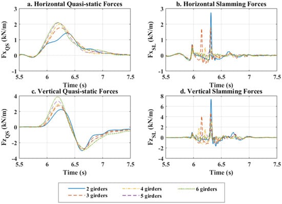 To determine if this true, a wavelet method was used to decompose the total force histories into the quasi-static and slamming components. An example of the decomposed components is shown in Figure 9 for SW3. The quasi-static component is a single, low-frequency fluctuation which is caused by the interaction between the wave and the structure, while the slamming component consists of a series of high-frequency impulses caused by the wave impacts on specific girders or chambers. Interestingly, for both the horizontal and uplift direction, the number of girders has an opposite effect on the quasi-static and slamming component, with the former one being increased by the increase of Ng, and the latter one being reduced. This opposite effect could potentially explain the complex role of Ng on the applied wave loads, observed in previous studies [40,50,51].