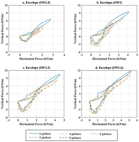 While the investigation of the horizontal and vertical force histories gave an insight into the applied loads on a bridge, it is important to look at the temporal evolution and combination of the forces in the two directions, since they will dictate the total demand and the critical load case for the bridge. For this reason, Figure 11 shows demand diagrams (similar to the ones in Istrati et al. [23]) which are the envelopes of the combination of the simultaneous horizontal and vertical forces applied during the inundation of the deck. It is clearly shown that the vertical wave forces are always higher than the horizontal ones (and in some cases almost twice) for different girder numbers and wave heights. Moreover, the shapes of the envelopes between the different decks with varying Ng have similarities, and in most cases the maximum horizontal and vertical force seem to be synchronized. However, the most important finding is that the two-and three-girder bridges have the largest demand, and that this demand decreases with the increase of Ng up until it becomes equal to 5, above which there are no differences. This indicates that during the design of a new coastal bridge that will have to withstand the impact of extreme waves, the number of girders in the deck can be optimized in a way that the wave loads will be small enough (requires a large Ng), while the volume of required construction material will not increase too much (requires a small Ng).