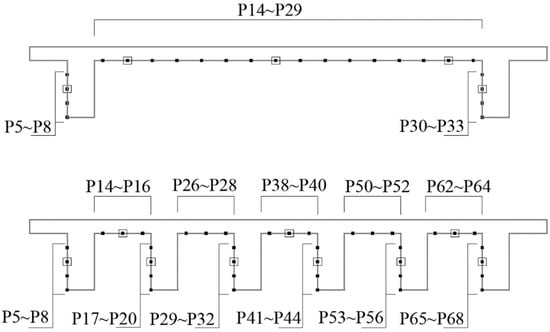 Locations of numerical pressure sensors on the girders and chambers: two-girder deck (top) and 6-girder deck (bottom).