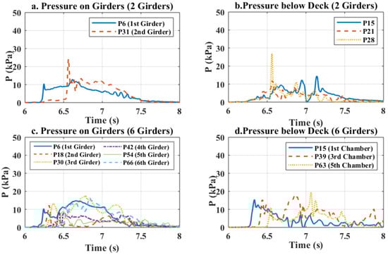 - On the other hand, in the case of the six-girder deck the maximums of the pressure histories are much smaller, with only some small-to-negligible impulsive peaks.