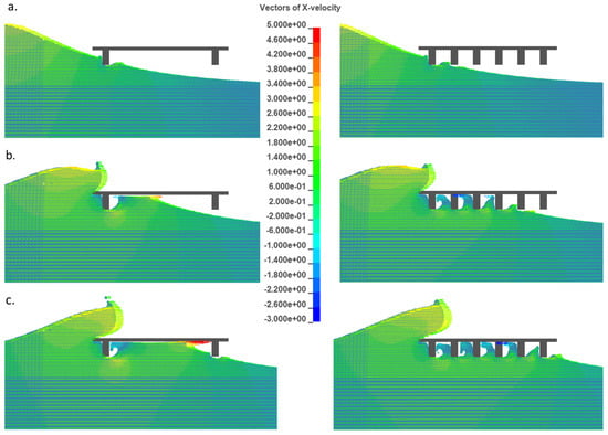 As demonstrated in previous sections, the increase of the bridge girders reduces the wave impact forces, which agrees partially with [40], who suggested that for certain conditions a girder can act as a barrier. This sounds surprising given the fact the surface of the girders is the one that attracts the horizontal forces, in the first place. To provide a thorough explanation it is imperative to understand how the existence of the girders affects the wave impact process and the flow of the fluid around the deck. This can be visualized in Figure 15 and Figure 16, which present a series of snapshots of the fluid velocity vectors in the horizontal and vertical directions respectively, for both the two- and six-girder bridge. It can be observed that: