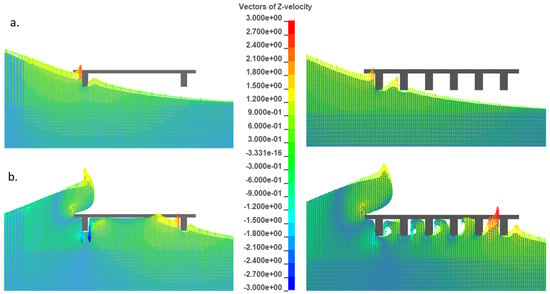Snapshots of the vectors of the vertical fluid velocities of wave SW3.6 (H = 0.85 m) impacting a deck with two girders (left) and six girders (right) at two instants: (a) t = 6.2 s and (b) t = 6.5 s.
