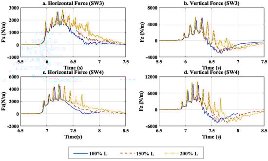 To eliminate the effect of the structural dynamics on the measured forces, both the experimentally and numerically recorded force histories are filtered using a Butterworth filter (with cutoff frequency of 30 Hz). The reason for choosing this filtering process has been thoroughly discussed in Xiang et al. [10]. Figure 3 shows a comparison of the horizontal and vertical wave force histories for SW3 and SW4. Note that the simulation of SW4 (in Figure 3c,d) was terminated slightly earlier than the entire impact process, but it was still able to capture the major impact characteristics. It can be observed that the maximum values of the numerical wave forces are close enough to the experimental measurements and the time histories are in reasonable agreement. Interestingly, the horizontal forces seem to be predicted more accurately than the vertical ones. In fact, the numerical simulations tend to over-predict the vertical wave forces and under-predict the horizontal ones, with the worst prediction corresponding to the downward force (negative values in the Fz graphs). A possible reason for this observation is the fact that as mentioned previously the numerical model does not capture accurately the tail of the wave, which will affect the volume and the shape of the fluid that will overtop the deck. Given the fact that elevated decks tend to fail due to the large horizontal or uplift force, and not due to the downward force, the focus of this study are on the two former types of forces. The good prediction of these forces demonstrates the accuracy of the ALE solver and the validity of the truncated numerical model.