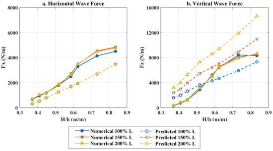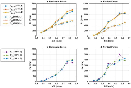 The explanation for the above trends is given by the decomposed components, shown in Figure 10c–f. The maximum values of the quasi-static components in the horizontal and vertical directions increase with a slow rate and in a nonlinear manner with the increase of Ng. Compared to the total wave forces, the quasi-static component seems to have a continuously increasing rate for all the wave heights. On the other hand, the slamming component seems to be affected by Ng in a similar way with the total wave forces, at least for the large wave heights. For these heights, the maximum slamming forces decrease significantly with the increase of Ng, while for small wave heights the maximum values are almost negligible, irrespective of Ng. It is noteworthy that: