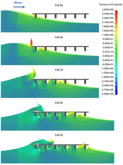Vectors of z-velocity during the impact of wave SW3 (H = 0.68 m) on the 150% L deck.