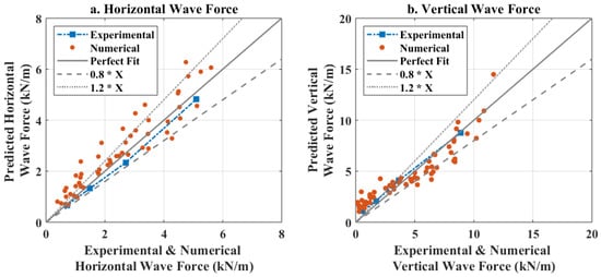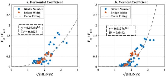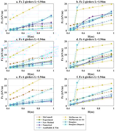As discussed in the introduction the role of the number of girders has not yet been deciphered. Thus, there are simplified predictive equations of wave loads in the literature, which give larger forces for a larger number of girders Ng (e.g., [7,8]) or are independent of the Ng (e.g., [9]). Based on the findings of the previous section, it became clear that (i) the number of girders Ng has a different effect on the slamming and quasi-static forces, and (ii) the bridge width does not affect significantly the maximum forces on an elevated deck. These findings can help improve existing wave force prediction methods. For example, Azadbakht and Yim [9], who investigated numerically five coastal bridges inundated by tsunami waves, developed the following prediction equations for the horizontal and vertical wave force:
