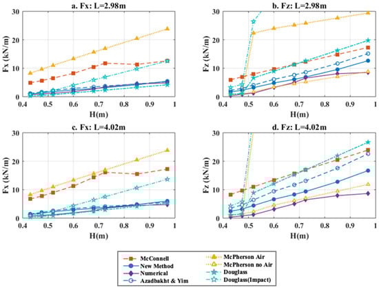 Regarding the horizontal force, the new method gives overall the most accurate results for the three decks, although for the two largest heights in the case of a deck with Ng = 2 the equations of Azadbakht and Yim [9] give better predictions. For the majority of the decks, the horizontal force predicted by Douglass et al. [7] under-predicts the actual force if the impact component is neglected and it over-predicts significantly if it is considered. On the other hand, the equation of McConnell et al. [6] and McPherson [8] tend to over-predict significantly the horizontal force for most cases (e.g., by a factor of 3.8 and 7.22 respectively for the largest height), with the former one under-predicting the force only for Ng = 2.