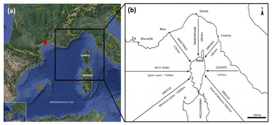 Location of Corsica Island and Sète (red symbol). (a) The map is adapted from Google Earth. (b) Wind provenance and crossed distance. The map is adapted from ROL Corse (Coastal Observatory Network of Corsica).