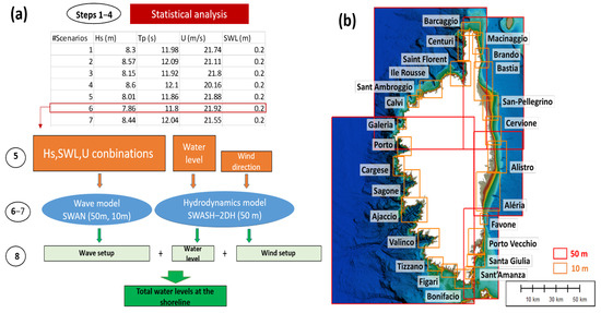 Finally, the purpose here was the assessment of the total water level at the shoreline in order to inform on the low-lying zones in Corsica potentially exposed to flooding. The next steps of the method were to determine areas that were geomorphologically homogenous based on orthophotos and fieldwork analyses, in order to complete the mapping [62]. Specific information on the swash were also computed using the SWASH model in its 1D configuration on some beaches identified as potentially impacted by swash and mechanical shocks due to waves, in current and/or future conditions.