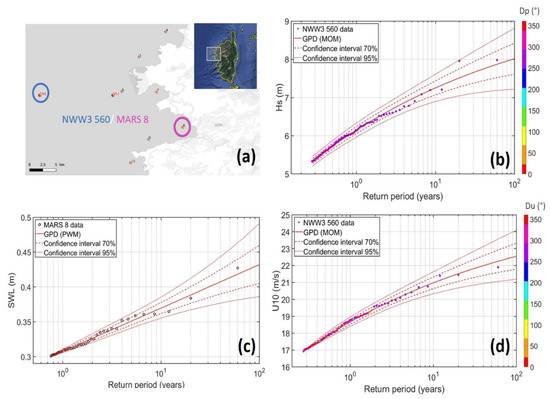 In addition, three methods for estimating the GPD parameters have been tested: the method of moments (MOM), the weighted method of moments (PWM), and the maximum likelihood method (MLE) [52]. Here (Figure 3b,d), the MOM was used to determine the parameters of the laws for Hs and U and the PWM method for SWL (Figure 3c), because these methods were the most conservative. Directions Dp and Du associated to Hs and U, respectively, are also reported in color. In this zone, the extremes are globally due to winds and waves with directions between 250 and 300°. Note that we chose to keep all directions Dp and Du, not only extremes coming from a given sector, because: (i) critical Dp for present day conditions are expected to change in the future due to future geomorphological changes on sandy coasts; (ii) only keeping data coming from a “given” sector can considerably reduce the sample size and increase the uncertainty in the statistical methods (marginals and dependence model). For instance, only 17% of data are kept if the dataset is split following directions between 200° and 250° for the NWW3 465/MARS 26 dataset (see Appendix C). Finally, the uncertainty associated with the distribution fitting is translated into the form of confidence intervals given using the parametric bootstrap [53]. Uncertainties related to the duration of the dataset may exist, but in our case, we have reduced them by using time series from numerical models with a common period of 30 years.