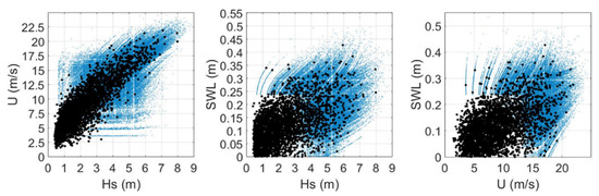 Once the parameters of the dependency relationship were estimated, a 10,000-year period was simulated applying a Monte Carlo method. We obtained a set of fictive sea states, wind, and SWL conditions as illustrated in blue in Figure 4. The simulated variables Yi are then transformed back to the original scales. Finally, the output is a large sample of sea and wind conditions (119,300 for the dataset NWW3 560/MARS 8) where at least one variable is extreme (i.e., exceeding a defined threshold) with respect to the individual marginal distributions, as well as the dependency relationship between variables.