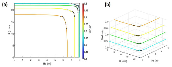 where λ is the number of events per year (in this case λ = 122) and T the return period considered in years. Figure 5a gives a 2D representation of the isocontours. The values on the isocontours are the SWL values from 0.2 to 0.4 m. From Figure 5a, it is then possible to identify combinations (Hs; SWL; U) of 100-year joint exceedance return periods. Figure 5b is a 3D representation of 100-year joint exceedance isocontours for the dataset NWW3 560/MARS 8. The black dots represent the combinations taken to force the hydrodynamic models. We have selected 34 scenarios for the dataset NWW3 560/MARS 8. These were selected along the isocontours by focusing preferably in the regions where the joint effect of the different drivers is the largest, i.e., where the convexity of the isocontours is the largest.