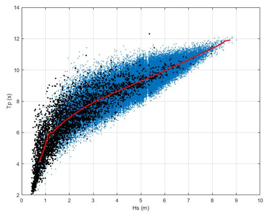 Relationship between Tp and Hs: declustered data (black dots), Monte Carlo simulation results (blue dots) for the dataset NWW3 560/MARS 8. The median is plotted in red.