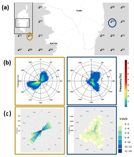 (a): Location of points NWW3 512 and NWW3 544 along Corsica. (b) Wave roses at point NWW3 512 (left) and NWW3 544 (right) giving the dominant peak direction (Dp) (°) and Hs frequency (‰). The black dashed lines represent the contour of extreme Hs. (c) Wind roses at point NWW3 512 (left) and NWW3 544 (right) giving the dominant wind direction Du (°), and U (m/s).