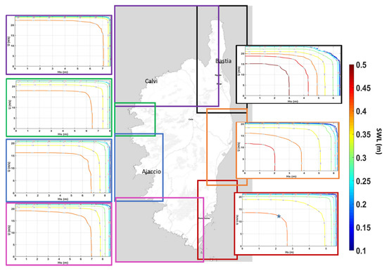 In this area, the tidal range is from 0.2 to 0.4 m as it is a microtidal regime [25]. For this reason, we consider a direct approach using the SWL instead of storm surges. Indeed, Haigh et al. [26] showed that for long return periods, when the ratio of the tidal to non-tidal component is lower than 2, direct and non-direct approaches present good agreement. Kergadallan [27] showed that this condition (<2) is observed for the French Mediterranean coasts.