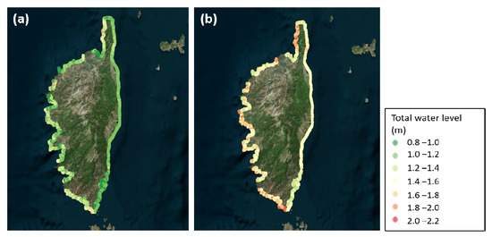 The SWAN and SWASH-2DH simulations (steps 6–7) provide the contributions to compute total water levels (TWL) (step 8) at the shoreline for each offshore condition combination tested (see Section 2.2 for details on the methods). Figure 9 illustrates the distribution of TWL along the shoreline (a) for current conditions, and (b) for future conditions (2100). For current conditions, the static TWL along the shoreline in the study area is between 0.80 and 1.8 m. For “2100” future conditions, the values are between 1.2 and 2.2 m. Clearly, outside the area on the west of the Cap Corse in the north of the island, this value is hardly reached even under future conditions. Moreover, we note that values of TWL are higher on the west coast rather than the east coast, especially in the north west and south west, for both current and future conditions.