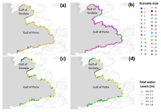 Finally, we tested the sensitivity of the results to the choices of the offshore conditions’ combinations: this is generally below 0.05 m and can be considered not significant. Only a few combinations show differences greater than 0.05 m. In particular, Figure 10a shows that combinations 19 and 27 lead to the highest total water levels at the shoreline in the Gulf of Porto considering the specific directions Dp = 270° and Du = 240°. Moreover, the directions Dp and Du of waves and winds influence the scenarios leading to maximum water level at the shoreline. Indeed, when applying other directions (even with small changes) Dp = 240° and Du = 240° to force the SWAN and SWASH-2DH models, the scenario leading to the highest total water levels is different: combination 17 (Figure 10b). The differences are particularly marked in the southern Gulf of Porto where total levels at the shoreline are higher when applying Dp = 270° and Du = 240° (Figure 10c) instead of Dp = 240° and Du = 240° (Figure 10d).