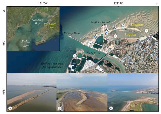 The sandbar-lagoon is a typical coastal accumulation landform body composed of three geomorphic units: sandbar, lagoon and tidal inlet, and is widely found in estuaries and other coastal areas with abundant sediment sources. The sandbar-lagoon coast has a typical sandy coastal ecosystem, offers unique landscape and scientific research value, and plays an important role in coastal protection, ecological balance and coastal landscape beautification. Lagoon coasts are widely distributed throughout the world []. In China, they are mainly found in Guangxi, Guangdong, Zhejiang, Liaoning, the Shandong Peninsula and North of Bohai Bay []. Though not large, coastal lagoons in China are numerous in number and type []. High-intensity coastal development in recent decades has subjected China’s lagoon coasts to varying degrees of damage []. Jingtang Lagoon [] and Qilihai Lagoon [] on the west coast of Liaodong Bay, and Chaoyang Port Lagoon, Moye Island Lagoon and Linjialiu Lagoon [] in the Shandong Peninsula have disappeared. The protection of lagoon coasts has attracted nationwide as well as worldwide attention [].