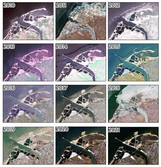 High-resolution remote sensing images of the study area have been collected since 2010 (Figure 2). The images from 2010 to 2019 were captured by SPOT, ZY and GF satellites, with a spatial resolution of 1.5–2.5 m. The images from 2020 to 2021 were captured by the Sentinel-2 satellites, with a spatial resolution of 10.0 m. Detailed information on each image is shown in Table 1.