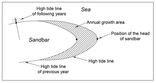 - Annual growth area of the sandbar. Draw the closed area formed between the outline of the sandbar in a certain year and the previous year. Therefore, the annual growth area of the sandbar can be obtained.