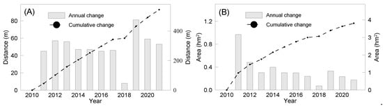 As the sandbar has extended, its area has continuously increased. The remote sensing images were interpreted to obtain the change in annual new growth area from 2010 to 2021 (Figure 4B). In 2011, the new growth area amounted to about 1.0 hectares, and in 2020, it was less than 0.2 hectares (Figure 5B). Thus, although the area of sandbar is still increasing, its new growth area has a decreasing trend (−0.05 hm2/a, R2 = 0.52).