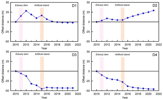 Longitudinal offset of the FESL at four sections. See Figure 1 for the section positions. Pink bands represent the construction of the estuary dam, and brown bands represent the construction of the artificial island. Positive values indicate migration toward the sea, and negative values indicate migration toward the land.