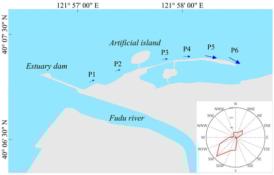 In the nearshore area, the sediments disturbed by wave breaking are transported under the action of wave-generated coastal current, which is called coastal sediment transport. On sandy coasts, coastal sediment transport mainly occurs within the surf zone. Coastal sediment transport is considered to be a decisive factor affecting the long-term evolution of sandy coasts []. For the study area, since the sea area near the sandbar dries out at low tide, the sediment along the sandbar is transported when the sea area near the sandbar is submerged by sea water. In order to find out the status of sediment transport in the study area, the CERC method was applied. The dominated wave direction of the sea area outside the Fudu Estuary is SW or WSW. Due to the coastline direction and topographic shielding, only waves with a direction between WSW and NNW can act on the sandbar-lagoon area. Six sections were selected (see Figure 7 for their positions); the sediment transport rate along the coast from each wave direction was calculated respectively according to the wave observation data (Figure 7), and the total sediment transport rate (TSTR) was calculated as the sum of the sediment transport rates in each direction. The results (Table 3 and Figure 7) reveal that sediment migrates from west to east along the coast; the closer to the east of the sandbar, the greater the TSTR. By comparison, the TSTR of sections P1, P2 and P3 is similar, while that of sections P4, P5 and P6 significantly and progressively increases, which is consistent with the rapid eastern movement of the head of the sandbar found by remote sensing. Therefore, the primarily W-oriented wave condition is the hydrodynamic basis of the continuous eastward extension of the sandbar.