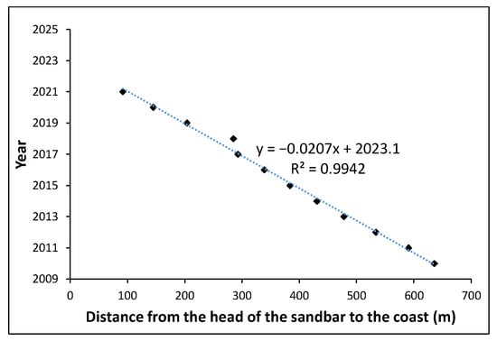 Linear regression relationship between the year and distance from the head of the sandbar to the coast.