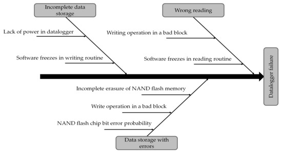 Ishikawa diagram for the evaluation of the cause-and-effect relationships in the datalogger storage and reading operations.