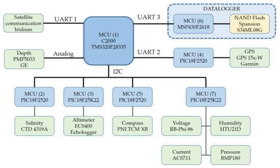 Before designing our datalogger, we carry out an analysis of the state of the art systems. There are several dataloggers, some for specific applications, others for general purposes. These have been used to validate prediction models based on environmental variables [25,29,30]. They have also been used in civil structures [31], livestock applications [32], biomechanical applications [33,34], energy monitoring [35], and for the internet of things [36]. However, the aforementioned commercial and non-commercial data loggers do not have the characteristics mentioned in the previous paragraph which are necessary to manage the different failure modes that could damage storage in an underwater environment. In addition, a datalogger must adapt to different devices, so it must of a suitable weight and size for underwater gliders [1,37]. These reasons justify the development of a tailor-made datalogger for the specific glider application.