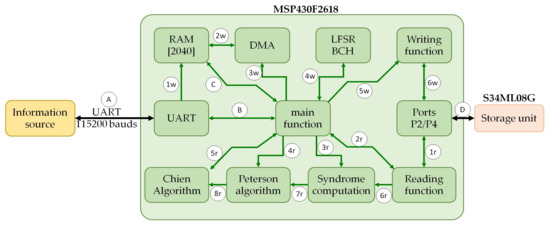 In the NAND flash read command, the microcontroller activates the Reading function (2r), then, the NAND flash memory chip is read (1r and D). The data received is transferred to the syndrome computation function (3r and 6r). Then, the error locator polynomial is searched through the Peterson algorithm (7r) function [49], and then the roots are calculated with the Chien Algorithm function (8r) that returns the positions of the errors [44,49]. With the positions of the errors, it is possible to correct corrupted bits of the NAND flash memory chip in order to send them to the data source via UART at 115200 baud (B and A).