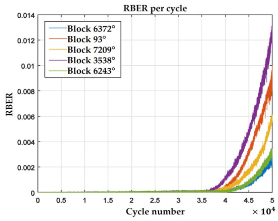 The storage device has two types of errors. The first one is due to the cells of the NAND flash memory chip are densely populated, and generate bit-flipping errors. Figure 5 shows the behavior in the degradation of the NAND flash blocks. To reduce this bit error rate (BER), the storage device must have an error correction code. The second error is due to the existence of bad blocks. A bad block is a block where data cannot be written or erased. The way to detect bad blocks is by reading the first byte of the spare area of the first page in each block [50]. In the case that the first page would have a bad block mark (00 h), then, a table of bad blocks must be updated and stored in a flash section of the microcontroller. This operation must be performed during the first time that the NAND flash device is used. If a block is erased, the bad block marks are also erased.