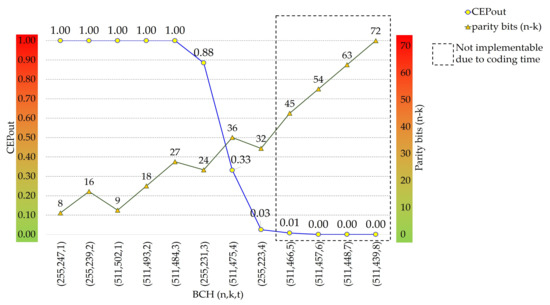 Comparative graph of different BCH codes with code sizes and . As more parity bits are added, the probability of on-chip error decreases. The dotted box contain ECCs that do not allow the encoding of the information in real-time for the used controller.
