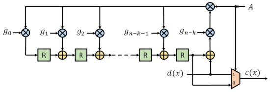 To obtain the parity bits, a systematic LFSR cyclic code encoder circuit is used as shown in Figure 5, where is the coefficient of the second term with the highest exponent of the generator polynomial and always takes the value of 1 as well as .