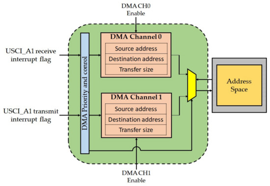 For the writing operation is required to send a command to the datalogger in order to perform the desired operation. To perform a write in a page is necessary to erase the block’s page. The erase operation is done out of the water when there is no more storage space. The erase time is not considered in the average performance because the memory chip is erased before the glider is submerged, then it is only written to NAND flash in which there will be no erase operations. In order for all data received by serial to be stored in the NAND flash memory chip, data encoding and writing operations in NAND flash must be performed in parallel with serial data reception. To achieve this, the DMA module is used for serial reception. Figure 9 shows the general DMA module diagram. There are three DMA channels. Initially, the datalogger used two modules: one for reception and the other for serial transmission. However, the bottleneck in reading NAND flash is decoding, and therefore we do not occupy DMA in serial transmission. Each DMA channel has three registers: the source address, the destination address, and the transfer size. For DMA channel 1, the source address is the serial UART RX buffer, the destination address is a vector where a message of k bytes is temporarily stored, which is the transfer size.