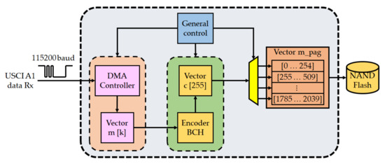 The block diagram for the write protocol of the NAND flash unit is described in Figure 10. Concurrent operations are performed, the CPU controls the send of commands to NAND flash for writing, reading, and erasing operations. In the other hand, the DMA performs serial reception. In Figure 10, the source address of the DMA is the RX buffer and all data that are received by serial bus through the vector m of k bytes. At the same time, the BCH encoder adds parity bits to vector m, the message and parity bytes are temporarily stored in a 255-byte vector c so that they are then stored in the vector that corresponds to a complete page of 2040 bytes. Then, data are stored in a NAND Flash memory page.