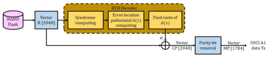 Then, the XOR operation between vector e and R is performed to obtain the vector that contains the decoding of the vector received from the NAND flash memory chip. In case the error correction capability is greater than the added errors, which in our case are a maximum of 4 errors, then the vector will be the same as , which is the code written in the NAND flash memory chip. As can be seen in Figure 12, the 2040-byte code is processed and the parity bits are removed. Then, the transmission consists on send 1784 (8 × 223) bytes. These data are of interest to the user: the message.