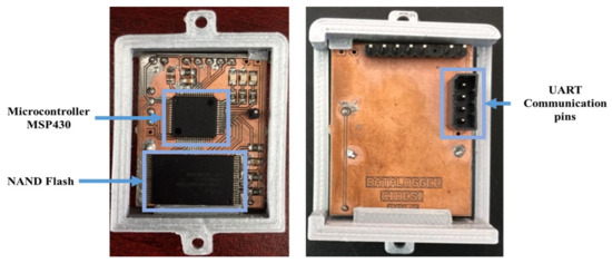 Our novel design, comprised of different layers of software integrated into a datalogger, uses a NAND flash memory chip, which is widely used due to its high speed in writing, reading, and erasing operations, and for its high storage density [38,39,40]. However, NAND flash memory chips suffer wear and bit-flipping because their cells are highly dense [41]. The writing/erasing operations degrade the NAND flash memory chip and increase the probability of bit-flipping. Error correction codes (ECC) are used to improve the reliability of NAND flash memory chips, reducing the probability of errors during their lifetime [42,43,44]. In this paper, the ECC used is a BCH, which is one of the most recently used in flash memory and digital communications systems [45,46]. The BCH code used corrects 4 bad bits per 255-bit code. An indicator of memory chip degradation is the decoding time, it means that, an increase in the reading time of the information is a sign that the memory chip is beginning to wear. This article describes the hardware and the different layers of software of the datalogger for orderly and correct storage. The characteristics that are described are as follows:
