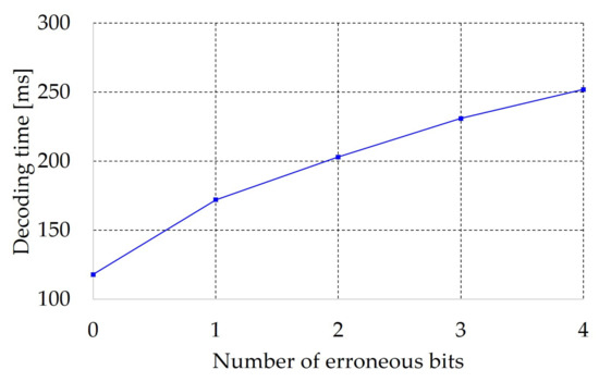 To test the BCH error correcting code, 0, 1, 2, 3, and 4 errors were added. The tests were performed in a way that there was exactly the same amount of errors in each code, with this, a homogeneous result would be obtained for a certain amount of errors, and with it, the decoding time in a certain correction capability. The result of reading the data decoding by BCH can be seen in Figure 15. It can be seen that as the errors increase, the decoding time also increases. It can be seen that the decoding time is proportional to the number of errors corrected. The decoding time increases because more operations are required to find the errors.