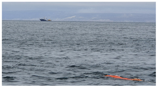 We carried out a first test of our glider at sea, specifically in the Bay of Todos Santos in Ensenada, Baja California, Mexico. Figure 16 shows the glider emerging from the depths of the sea. Seven successful tests were carried out at a depth of up to 50 m. However, in the last test, the glider antenna did not withstand the pressure of 50 m. Therefore, the tests at that depth were concluded. The test allowed us to obtain important information about the glider operation, to be able to improve it. The operation of the datalogger went as expected during the mission.