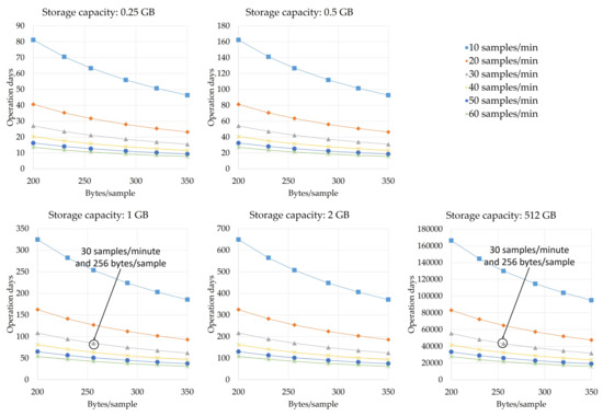 Maximum storage period for different capacities that can be achieved in NAND flash memory units. For a storage capacity of 1 GB, 30 samples per minute, and length of 256 bytes per sample, it is possible to achieve a storage time of 84 days. In case a storage was done on a larger capacity NAND flash memory like 512 GB, then it could be stored for more than 40,000 days.