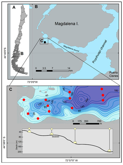 Study site. The study was carried out in the Magdalena Sound, which is a fjord located in the Puyuhuapi Channel in the Aysén region of Chile (Figure 1). The Magdalena Sound is bordered by the town of Puerto Cisnes on Magdalena Island, and is the deepest branch of the Puyuhuapi Channel, approximately 14 km long, 350 m deep and comprised mostly of vertical stone walls [14,15]. The area contains high amounts of dissolved organic matter, both of autochthonous (i.e., primary production) and allochthonous origin (i.e., discharge from rivers and aquaculture activities), and is influenced by the interaction of fresh water and seawater. This generates estuarine stratification, with the first layer (0–10 m deep) composed of brackish water and the deeper layers composed of seawater of sub-Antarctic origin [14,15].
