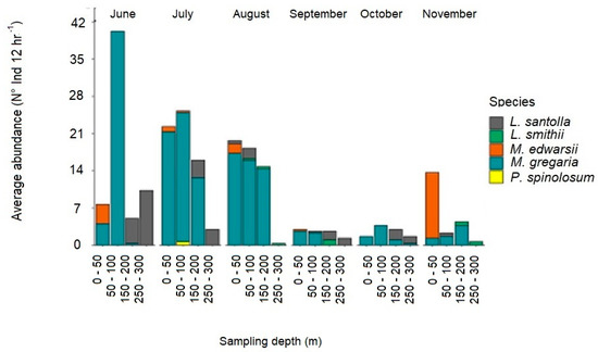 With respect to a separate study of decapod species abundances also recorded in the Magdalena Sound in different bathymetric strata in June 2019 [14], our results showed that the mean abundance of M. edwardsii recorded in the first stratum (3.67 ± 1.53 specimens 12 h−1) was slightly higher than recorded in the same stratum by the previous study (0.92 ± 0.38 specimens 12 h−1) [14]. The mean abundance of L. santolla recorded in the third and fourth strata (4.67 ± 2.51 and 10.33 ± 8.62 specimens 12 h−1, respectively) was higher than that previously recorded in the same strata (1.17 ± 0.63 and 2.58 ± 2.16 specimens 12 h−1, respectively). The mean abundance of M. gregaria in the three most superficial strata (4.00 ± 6.08, 40.33 ± 10.70 and 0.33 ± 0.58 specimens 12 h−1, respectively) was higher than that previously recorded in the same strata (1.00 ± 0.52, 10.08 ± 3.93 and 0.08 ± 0.14 specimens 12 h−1, respectively). The high abundances of M. gregaria that we recorded in the most superficial strata in June–October are similar to those reported by Betti et al., 2020 [27] for the Puyuhuapi and Jacaf fjords, and show the importance of M. gregaria as a key species within the sub-Antarctic marine ecosystem of South America, representing a fundamental trophic link between the detritus-based food chains and higher-level predators [27].