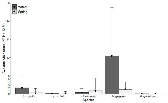 Mean (±standard deviation) seasonal abundance of the decapods associated with the southern king crab fishery. Black rhombuses correspond to the mean abundance estimated by GLM.