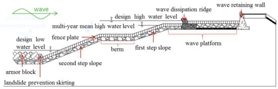 The physical and numerical models were defined based on the breakwater design layout to be built on the north shore of Meizhou Bay [18,19]. The breakwater adopts the stepped revetment structure composed of a wave platform, a first step slope, a berm, and a second step slope (Figure 2). The alternation of platforms and slopes is beneficial for the wave energy dissipation and wave breaking on a large scale. The whole surface of the breakwater is covered with a fence plate structure, which can break the waves on a small scale through the cavities. In addition, the block revetment structure is arranged on the breakwater, including the armor block at the foot of the breakwater and the wave dissipation ridge on the wave platform. The landslide prevention skirting at the foot of the breakwater is used to stabilize the superstructure. To further reduce the amount of overtopping, a wave retaining wall is placed at the top of the breakwater.
