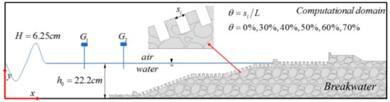 A numerical model was established according to the physical model. The length and height of the numerical tank are 20 m and 0.5 m, respectively. The still water depth is 0.222 m. The mesh resolution around the breakwater is 0.0025 m, while the mesh resolution of the other areas is 0.01 m (White, 2003) [25]. The origin of the coordinate system is at the bottom of the numerical flume. The inlet is the numerical wave-making boundary, and the outlet is the free outflow boundary. Corresponding to the physical experimental case 5 (the regular wave height H is 0.0625 m), the characteristics of wave run-up and dissipation under the regular wave with and without fence plate are studied numerically. To provide a reference for the design and engineering practice of the fence plate, the effects of the different gap ratio (θ) of the fence plate on the wave propagation are studied to find the wave-reducing law under different fence plate. The gap ratio refers to the proportion of the sunken area (si) to the whole area (L) of the fence plate. In the simulations, seven gap ratios are set as 0, 30, 40, 50, 60, and 70 percent. The gap ratio without the fence plate is 0. Two wave height sensors, G1 and G2, are set at 0.5 m and 6.5 m from the wave inlet boundary, respectively. The schematic diagram of numerical model is displayed in Figure 4.