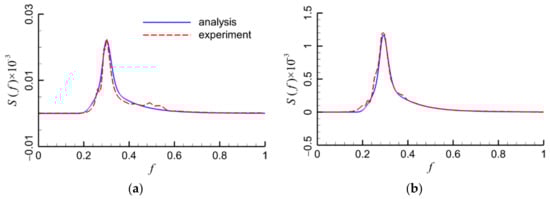 In order to ensure the accuracy of the experiments, it is very important to generate a wave that meets the requirements of the experimental cases (Table 1). Therefore, the accuracy of regular wave and irregular wave energy spectrum in the physical model and numerical model is verified before the experiment. Figure 5 shows the comparisons of the temporal evolution of the regular wave under the cases of 1, 3, and 5. The ratio (ζ = H/h) is of the wave height to the still water depth. The maximum ratios and the periods in the cases 1, 3, and 5 are 0.1375 and 3.5 s, 0.2083 and 3.4 s, and 0.2815 and 3.3 s, respectively. In Figure 5c, the results of the analysis, experiment, and simulation about case 5 are compared. The waves generated in the experiments in cases 3 and 5 are little larger than the theory waves. This may be because after the wave is made at the inlet, the wave generation velocity is slightly higher than the wave propagation wave and the experimental wave is with a large amplitude. Depending on the comparison of the regular waves, although there is a small deviation in comparisons, it is found that the results of the analysis, experiment, and simulation are in good agreement. Besides, Figure 6 shows the energy spectra comparison of irregular waves under the cases 2, 4. and 6. The ratios (ζ) of the significant wave heights to the still water depths are 0.1357, 0.2083, and 0.2552, respectively. The corresponding frequencies are 0.2857, 0.2941, and 0.3030 Hz, respectively. In the spectrum comparison, it fluctuates slightly due to the instability of the experiment. Nevertheless, the experimental results are in good agreement with the analysis results. According to the wave calibration, the physical and numerical experiments can generate the steady and accurate waves.