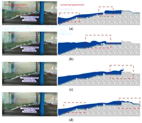 Comparison of flow field between the physical and numerical experiment; (a) wave run-up; (b) wave breaking; (c) wave overtopping; (d) water falling back.