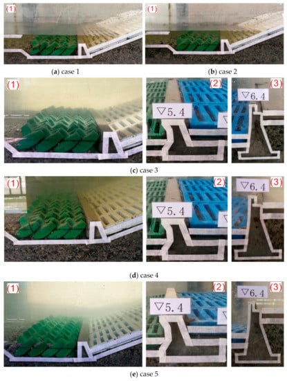 Under different still water depths and waves, the stability of wave retaining wall, wave dissipation ridge, fence plate, armor block, and landslide prevention skirting is investigated. After the waves act on the breakwaters, the situation of each part of the breakwater in all cases is shown in Figure 8. For cases 1 and 2, the wave runs up and down on the second step slope, impacting the second step slope, the landslide prevention skirting and the armor block. It is found that both the armor block and land slide prevention skirting remain stable without movement or damage as the still water level is around the fence plate (Figure 8a,b). For cases 3 and 4, the still water level is the multi-year mean high water level around the first step slope. The waves act on the upper parts of the breakwater, such as the first step slope, the wave dissipation ridge, the wave platform, and the wave retaining wall. Figure 8c,d show that both the wave retaining wall and the wave dissipation ridge do not overturn, move, or reverse, indicating that they have a good blocking effect on the waves. In addition, the fence plate is also stable. When the still water level is the design high-water-level at the wave dissipation ridge which is directly impacted by the wave, it is noted that the ridge and other parts of the breakwater are still stable. However, there are some differences. In Figure 8e,f, a small amount of sediment is brought from below the fence plate at the wave platform to the surface of the fence plate around the wave dissipation ridge. In Figure 8f, some sediment is carried out and deposited on the armor block, which may lead to the burying of the armor blocks. When it is submerged, its wave-absorbing function is weakened, the still water depth is reduced and the wave has a strong action on the breakwater. In general, on one hand, under different environmental conditions, the breakwater and its elements can remain stable, indicating that the structure design of the breakwater is reasonable. This type of breakwater is suitable for the north shore section of Meizhou Bay. On the other hand, the high water level and the high waves are still important factors threatening the safety of the breakwater and its elements.